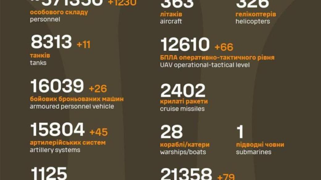 За минувшие сутки оккупанты потеряли еще 1 230 единиц личного состава, 2 ПВО и более 200 единиц техники.