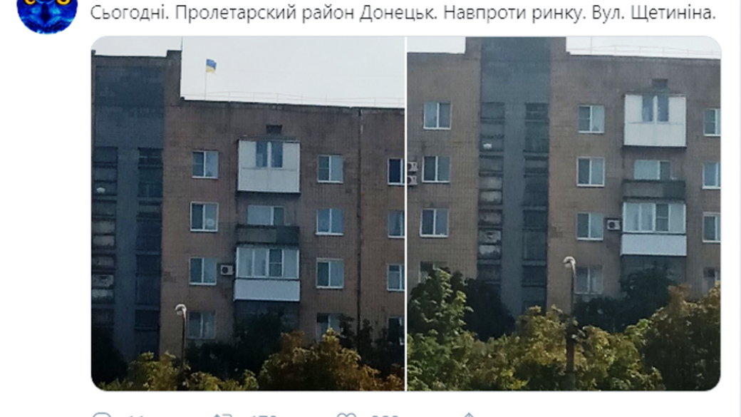24 августа неизвестные патриоты вывесили украинский флаг на пятиэтажном жилом доме Пролеторском районе неподконтрольного Украине Донецка по улице Щетинина. Об этом сообщают местные жители в социальных сетях.