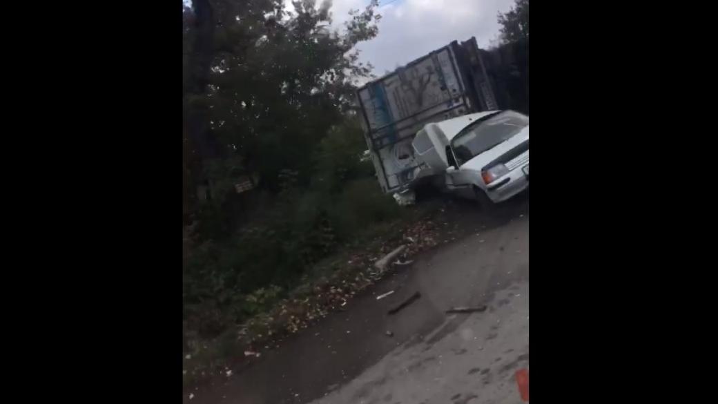 Макеевчане показали в соцсетях видео аварии. на кадрах видно, врезавшуюся в фургон грузового автомобиля, «легковушку», а также, вынесенный, а обочину внедорожник, и автомобиль скорой помощи