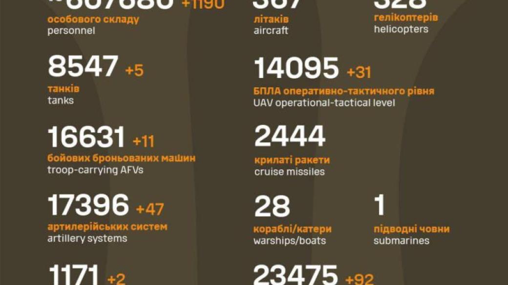 За минувшие сутки Силы обороны ликвидировали 1190 российских захватчиков и более 200 единиц вражеской техники.