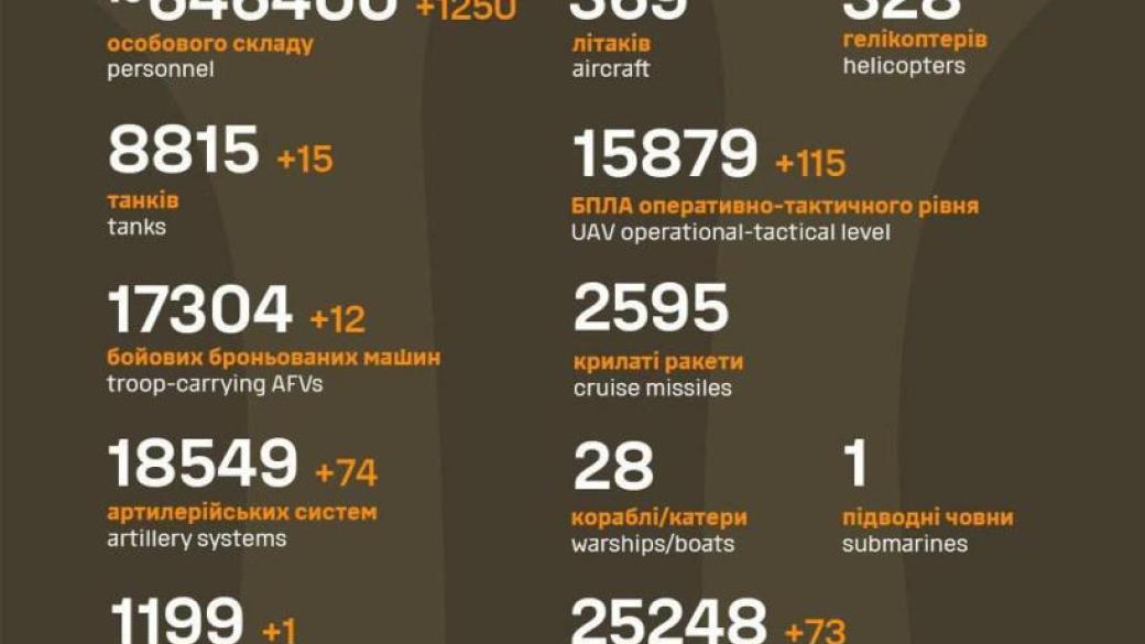 В течение минувших суток оккупанты потеряли на фронте 1250 единиц личного состава и более 300 единиц различной техники.