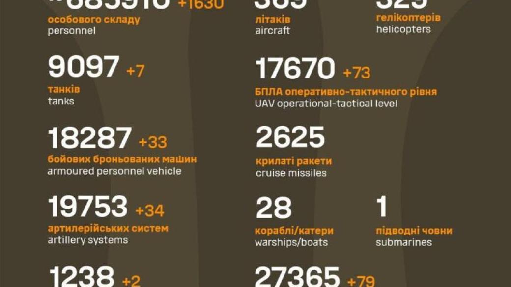 За прошедшие сутки украинские защитники ликвидировали 1630 оккупантов и более 250 единиц вражеской техники.