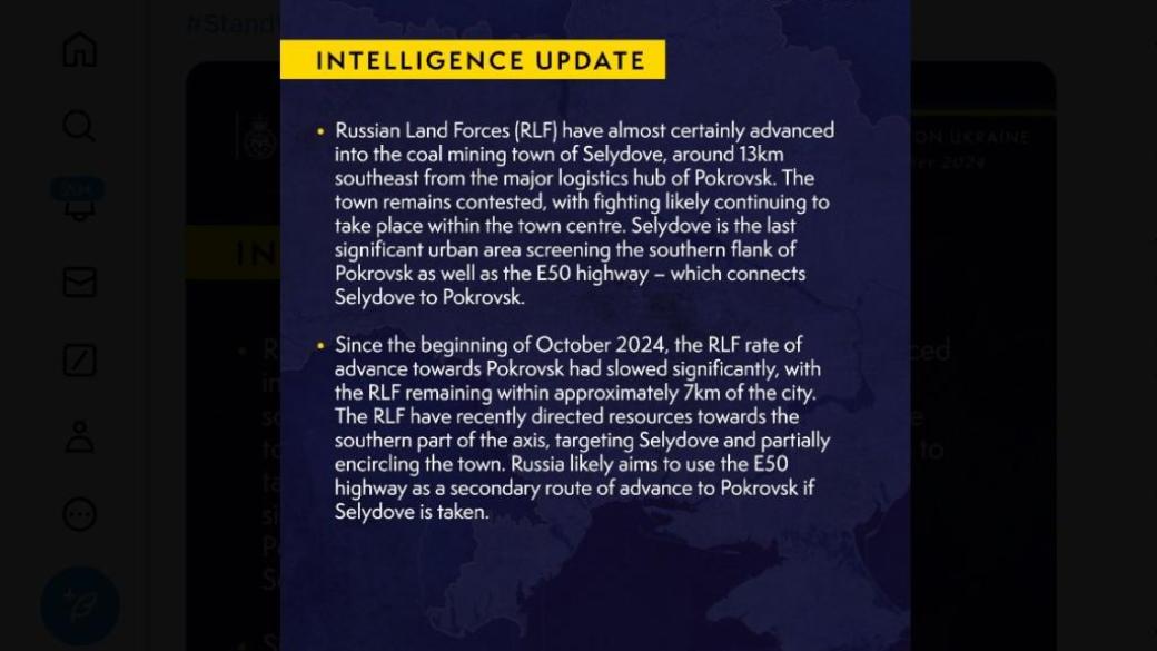 "Российские сухопутные войска почти наверняка продвинулись в шахтерский город Селидово, расположенный примерно в 13 км к юго-востоку от крупного логистического центра Покровск. Город остается спорным, и бои, вероятно, продолжаются в его центре".