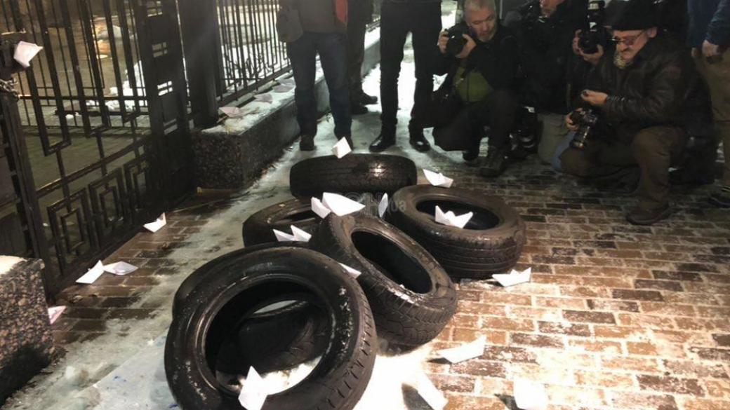 Под посольство Российской Федерации в Киеве участники протеста принесли шины и разложили на парапете посольства бумажные кораблики.