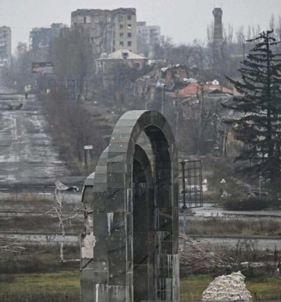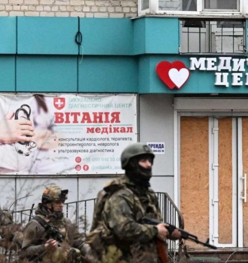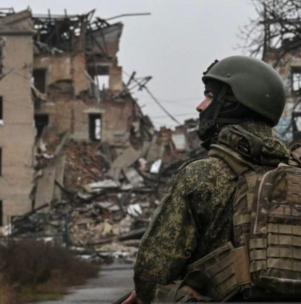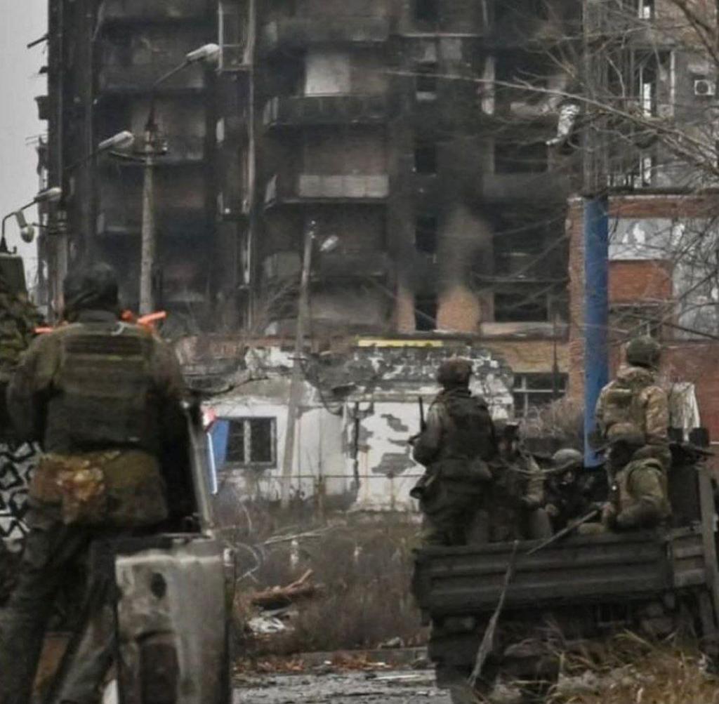 На снимках показаны оккупанты, передвигающиеся по улицам между зданиями, превращенными ударами войск рф в руины.