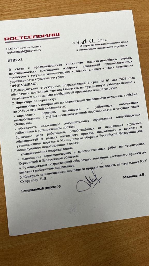 Журналист Роман Цимбалюк обнародовал приказ гендиректора "Ростсельмаша" (один из крупнейших российских заводов по производству сельскохтехники в Ростове-на-Дону), который, по сути, фиксирует скрытую форму мобилизации в рф. Документ он опубликовал в своем блоге в Facebook, сообщает Диалог.