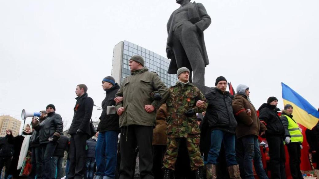 На первом фото в пальто стоит организатор пророссийских беспорядков - секретарь горсовета Богачев. Позже он будет утверждать, что не имеет к ним отношения, хотя изначально именно он курировал установку палаток и подвоз титушек. А когда начнётся война Богачев первым слиняет из города в Россию, подставив под пули и снаряды своих избирателей.