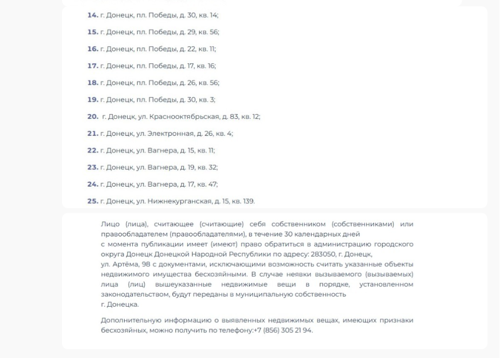 В указанном сообщении перечисляются квартиры, "имеющие признаки бесхозяйных", а также заявляется следующее: "Собственники или правообладатели в течение 30 календарных дней с момента публикации имеют право обратиться в администрацию по адресу: ул. Артёма, 98, с документами, исключающими возможность считать указанные объекты недвижимого имущества бесхозяйными". В противном случае квартиры будут конфискованы.