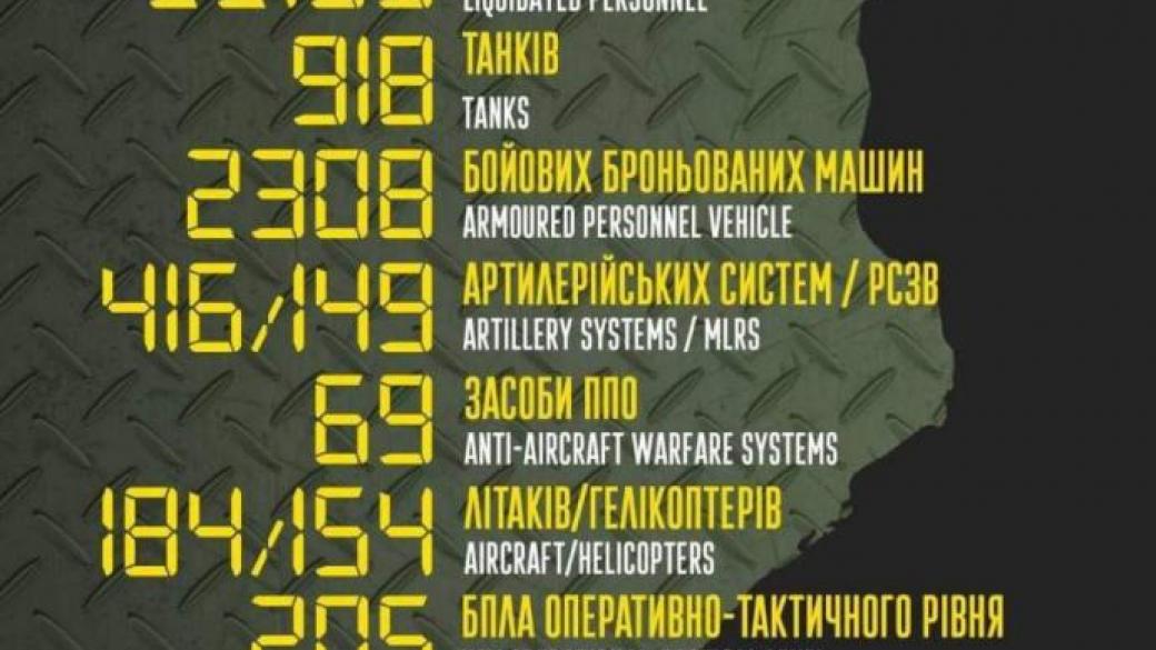 С начала российского вторжения в Украину общие боевые потери противника с 24.02 по 26.04 ориентировочно составили около 22 100 (+200) человек личного состава. Об этом сообщает Генштаб ВСУ.