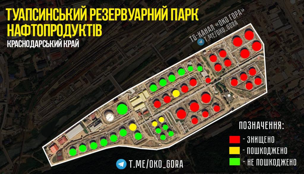 Украинский OSINT ТГ-канал Око Гора+ показал итоги атаки БПЛА по резервуарному парку в Краснодарском крае: