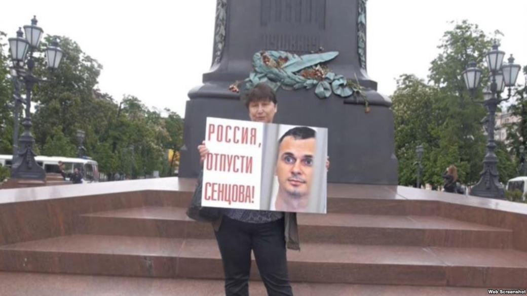 «Глеб Мазалов вышел сегодня 26 мая в одиночный пикет к памятнику Пушкина с плакатом «Россия отпусти Сенцова!». Простоял 45 минут и его увезла милиция в ОВД Тверское на Дмитровке. На площади ходит оперативник в штатском и следит за публикой.
