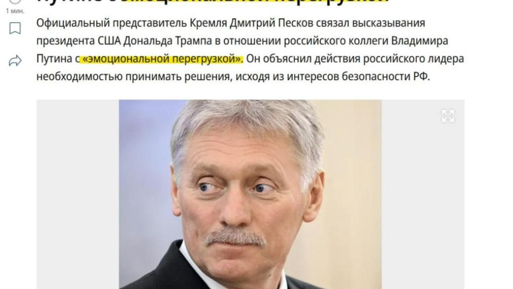 Президент рф Владимир Путин принимает решения по Украине в "интересах безопасности" россии. Об этом комментируя заявление президента США Дональда Трамп о сумасшествии Путина, заявил пресс-секретарь Кремля Дмитрий Песков,.