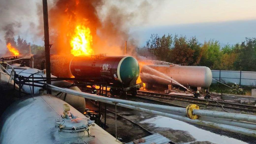 По предварительным данным, на железнодорожном полотне находилось семь цистерн в сцепке, из которых три цистерны были охвачены огнем. Ликвидация пожара продолжается. По оперативной информации, пострадавших нет.