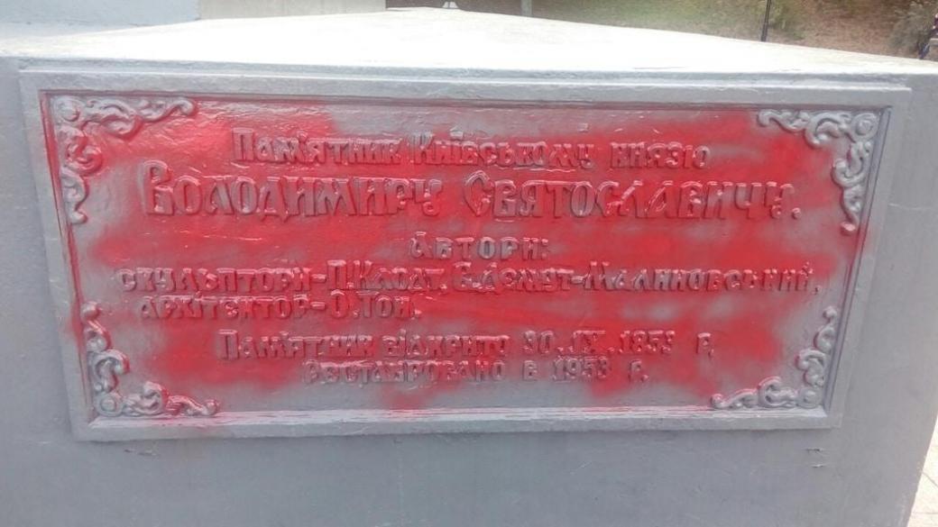 Памятник Владимиру Великому в Киеве был облит краской неизвестными вандалами.