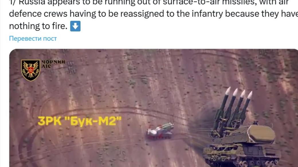 "Судя по всему, у России заканчиваются ракеты класса "земля - воздух", а расчеты ПВО приходится переводить в пехоту, поскольку им нечем стрелять".