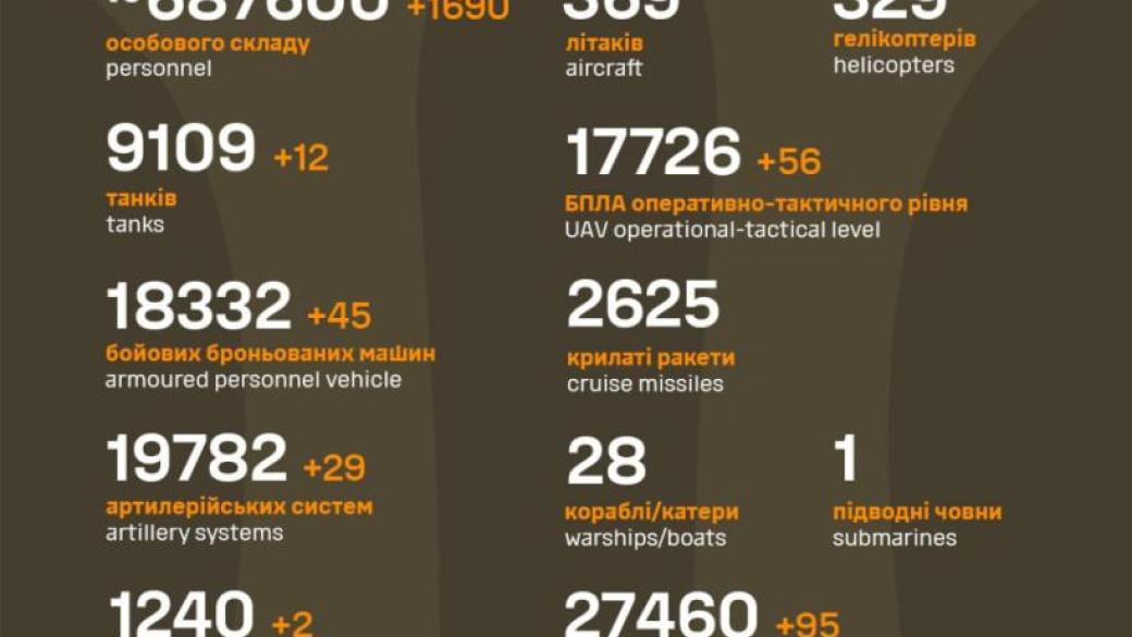 За прошедшие сутки Силы обороны ликвидировали 1690 захватчиков и более 240 единиц техники врага.