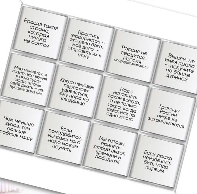 На каждой из них обложка с цитатой путина. Среди них: "Границы россии нигде не заканчиваются", "Мы готовы принять любой вызов времени и победить!", "Если драка неизбежна, бить надо первым".