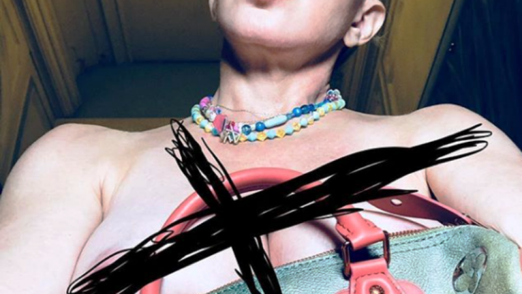 Так, на данном снимке она снята топлес, при этом она прикрывает грудь сумкой Louis Vuitton. На сумке изображена Мона Лиза Леонардо да Винчи.