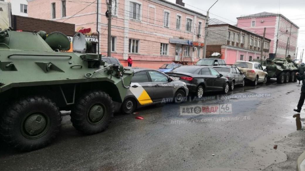 По данным издания, инцидент произошел днем 27 февраля на улице Красной армии. В колонну военной техники, которая двигалась из курского гарнизона, затесались несколько гражданских авто. Позже они оказались зажатыми между двумя БТРами.