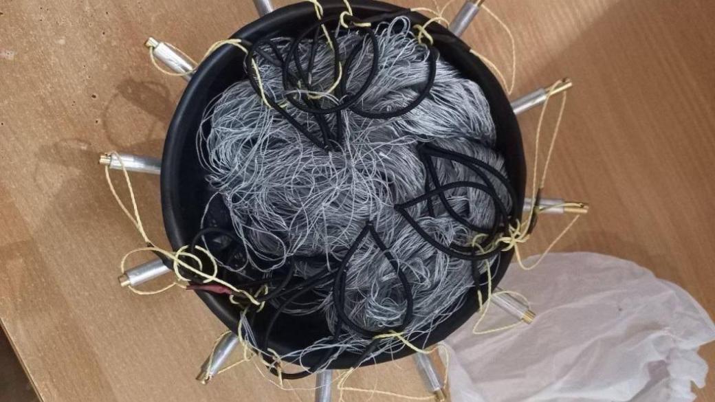 .Эта штука цепляется на дрон, в ней сетка и патроны. Когда дрон засекает другой БПЛА сверху, нажимается на пуск, пиропатрон срабатывает и сетка накрывает беспилотник.
