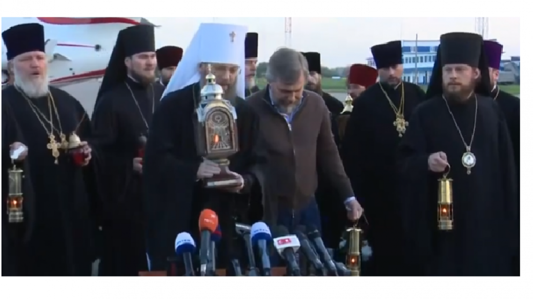 В аэропорту перед журналистами и верующими выступил представитель украинской делегации ПЦУ митрополит Луцкий и Волынский Михаил. Огонь раздавали всем желающим.