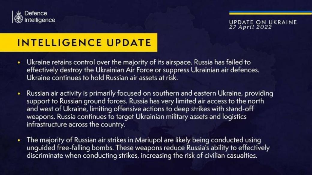 Украина сохраняет контроль над большей частью своего воздушного пространства, так как России не удалось эффективно уничтожить украинские ВВС или подавить украинскую систему ПВО. Об этом сообщают в разведке Великобритании.