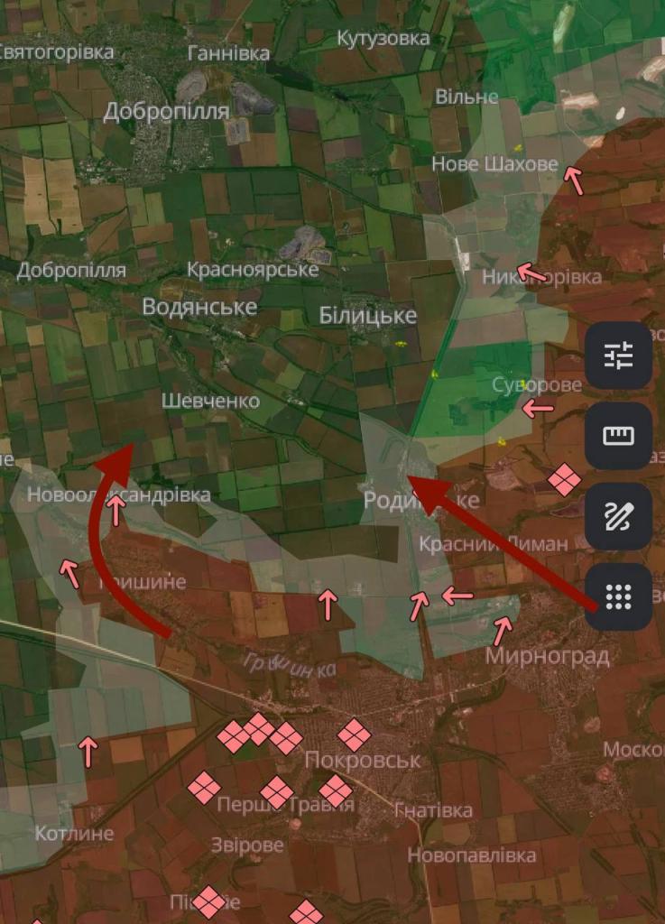 «Враг усиливает наступательные действия в направлении н.п. Шевченко со стороны Гришино, к югу от Доброполья, чтобы перерезать всю логистику и выйти в тыл подразделениям СОУ, которые удерживают Родинское», — пишет «Алекс».