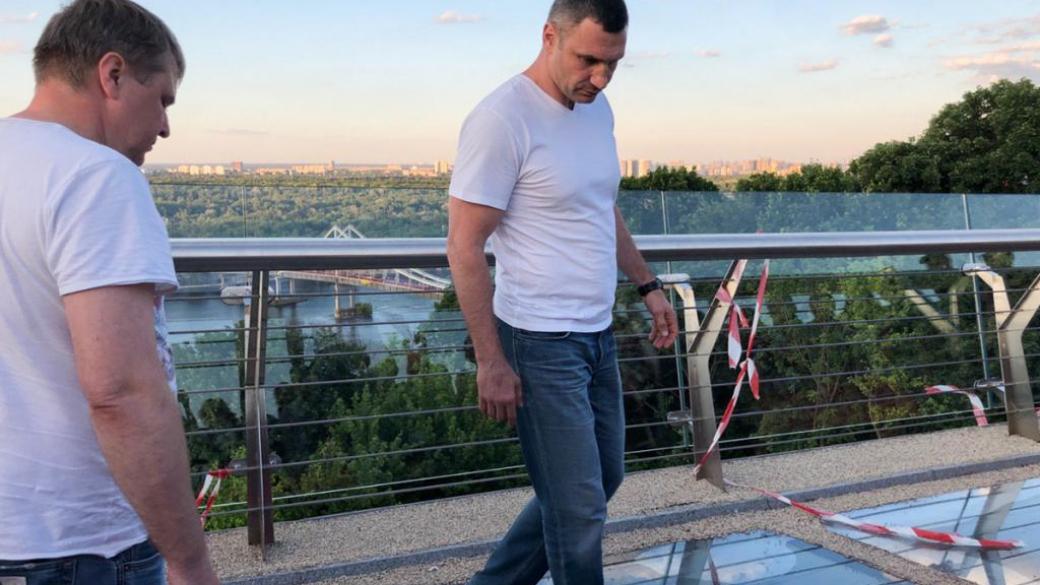 Новый стеклянный мост в Киеве, неизвестные умышленно повредили тяжелым предметом. об этом написал мер Киева Виталий Кличко в Facebook.