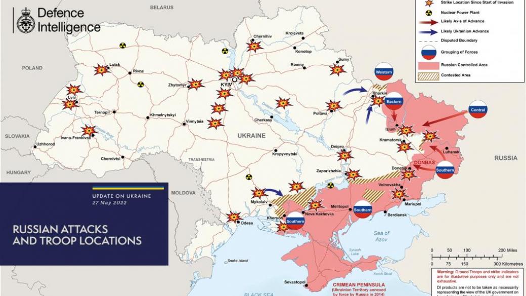 Минобороны Великобритании опубликовало новую карту боевых действий в Украине по состоянию на пятницу, 27 мая. Как утоняют в британской разведке, главная линия фронта сейчас проходит на востоке и частично юге Украины.