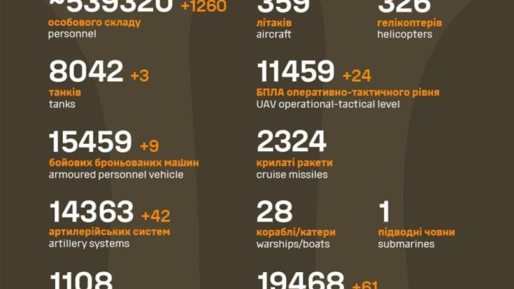 - личного состава - 539 320 (+1260) человек ликвидировано;