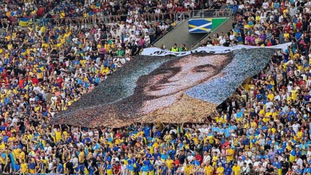 Украинские болельщики развернули баннер с изображением погибшего украинского военного Назария «Гренки» Гринцевича на матче Евро-2024 между Украиной и Бельгией.