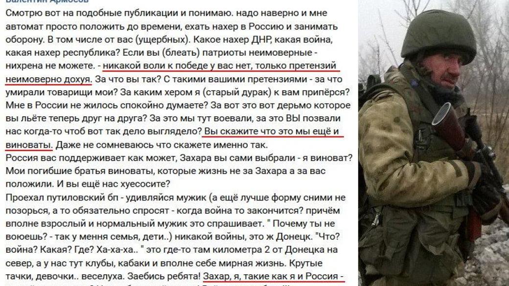«Надо, наверно, и мне автомат просто положить до времени, ехать на**р в Россию и занимать оборону. В том числе от вас (ущербных). Какое на**р ДНР, какая война, какая на**р республика? Если вы (бл**ть), патриоты неимоверные, нихрена не можете: никакой воли к победе у вас нет, только претензий неимоверно до**уя. За что вы так? С такими вашими претензиями — за что умирали товарищи мои? За каким хером я (старый дурак) к вам приперся? Мне в России не жилось спокойно, думаете?» — разразился тирадой оккупант.