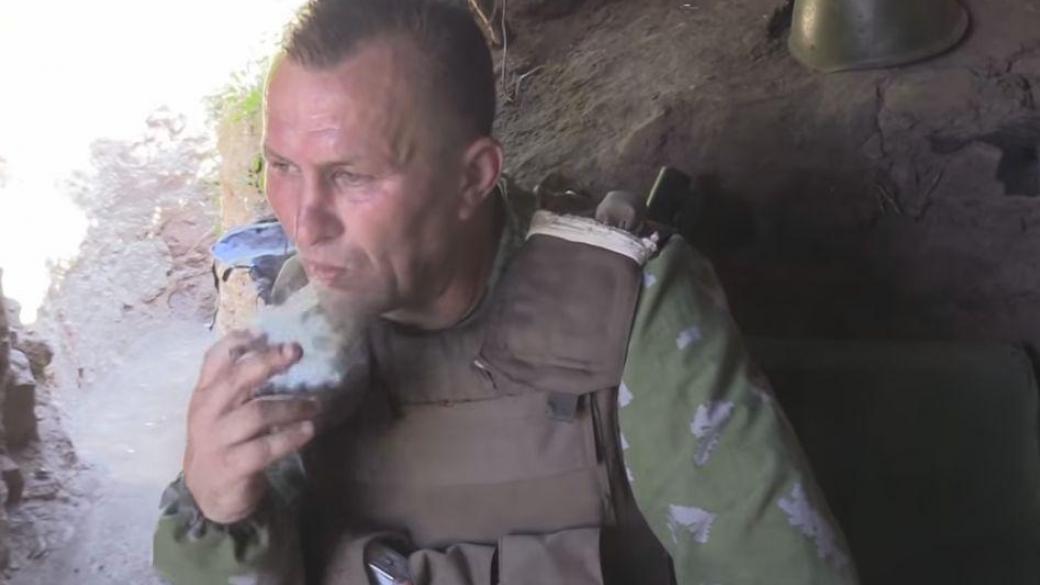 На лице командира землекопов хорошо различимы следы разного рода злоупотреблений. С характерным акцентом и косноязычием он рассказал о своем «славном прошлом» — об участии в вооруженном сопротивлении под Славянском. Террорист продемонстрировал свежевырытые траншеи «удавки» вокруг Горловки.