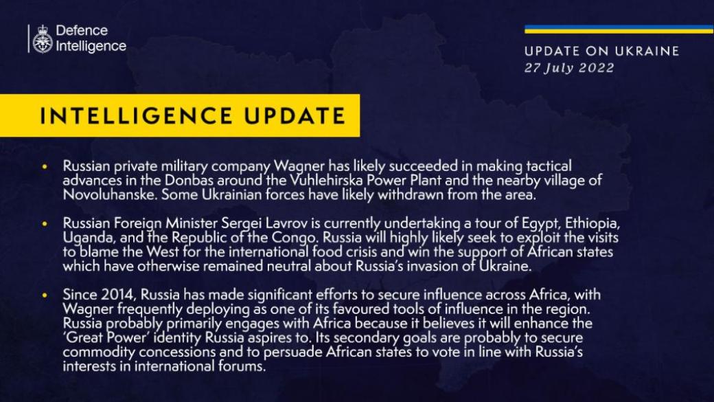 По данным британской разведки, министр иностранных дел России Сергей Лавров совершает поездку в Египет, Эфиопию, Уганду и Республику Конго, чтобы использовать визиты на Запад для международного продовольственного кризиса и заручиться поддержкой африканских государств, которые в остальном сохраняли нейтралитет в отношении российского вторжения в Украину.