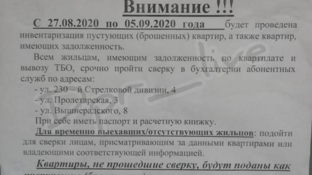 «С 27 по 5 сентября будет проведена инвентаризация свободных и брошенных квартир, а также квартир, имеющих задолженности. Квартиры, не прошедшие сверку, будут поданы как пустующие и брошенные для дальнейшего рассмотрения».