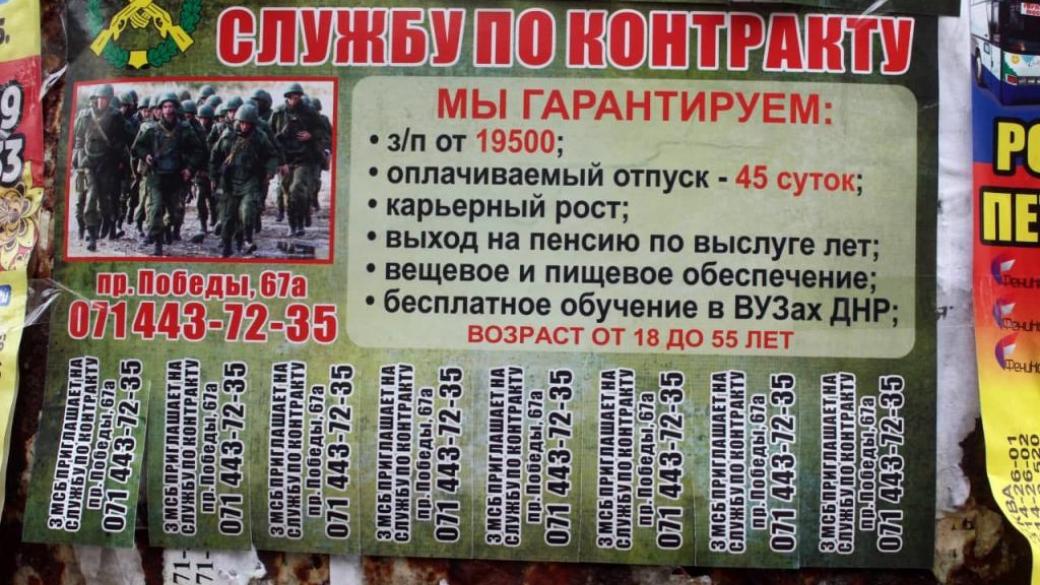 Он опубликовал фото объявления в котором сказано, что в 3 МСБ набирают желающих на службу о контракту и предлагают зарплату 19 500 рублей. Также «есть перспективы карьерного роста, возможность бесплатного обучения в вузах ДНР, отпуск 45 дней» и другие «бонусы».