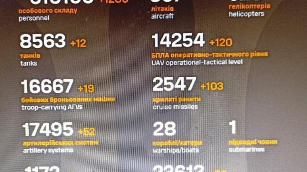 За прошедшие сутки ВСУ ликвидировали 1 280 оккупантов и более 360 единиц техники и оружия.
