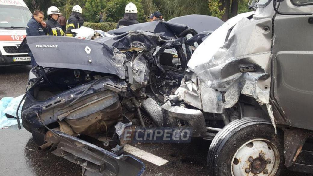 Трагедия произошла сегодня утром на проспекте Лобановского. По предварительным данным, на мокрой дороге не смог справиться с управлением водитель такси Renault. Он выехал на встречную полосу и столкнулся с грузовиком «ЗИЛ».