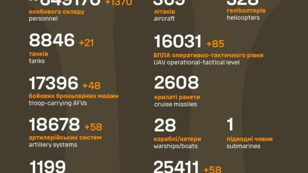 За минувшие сутки Силы обороны ликвидировали 1370 оккупантов, 2 средства ПВО и более 250 единиц техники.