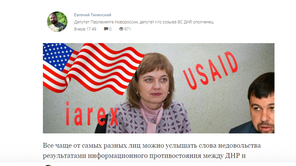 Член НВФ Евгений Тинянский и телеграмм-канал «Донецкий Абориген» на своих страницах в соцсети сообщают, что тетя так называемого «главы ДНР» Дениса Пушилина, Елена Никитина, якобы много лет «работала на ряд американских госдеповских структур (MSI, USAID и прочими) и является иностранным агентом».