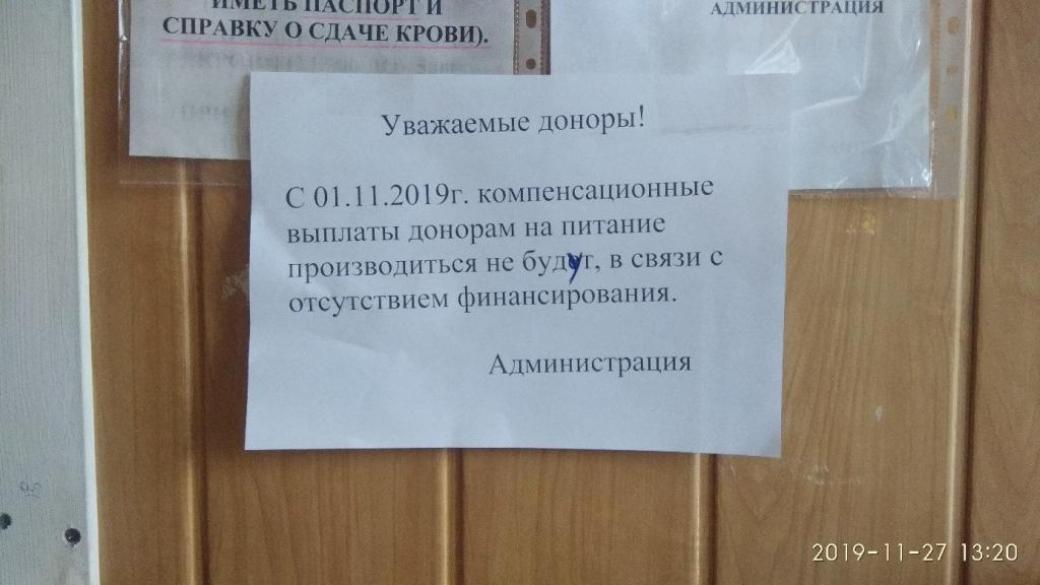 Он опубликовал фото объявления, которое было вывешено на двери больницы. В тексте сказано, что с 1 ноября 2019 года компенсация на питание донорам выплачиваться не будет. Причина: отсутствие финансирования.
