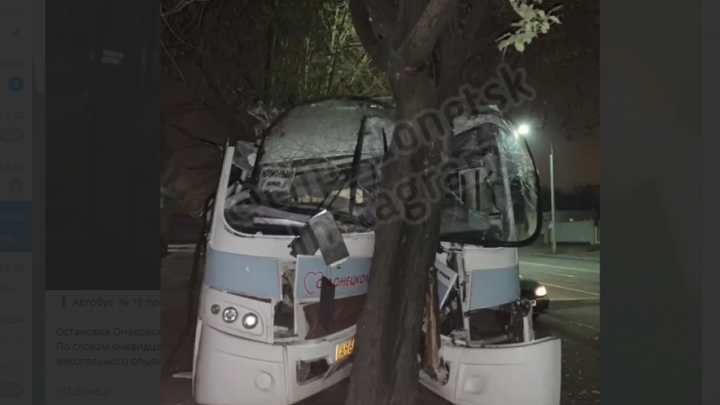 В неподконтрольном Украине Донецке пассажирский автобус № 19 протаранил дерево. Об этом сообщают очевидцы в социальных сетях и публикуют соответствующие фото.