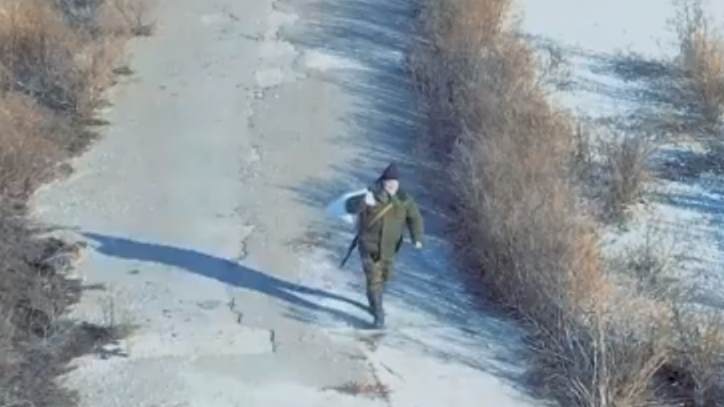 На кадрах видно, как член НВФ спокойно передвигается, однако, украинские военнослужащие не стреляют в противника.