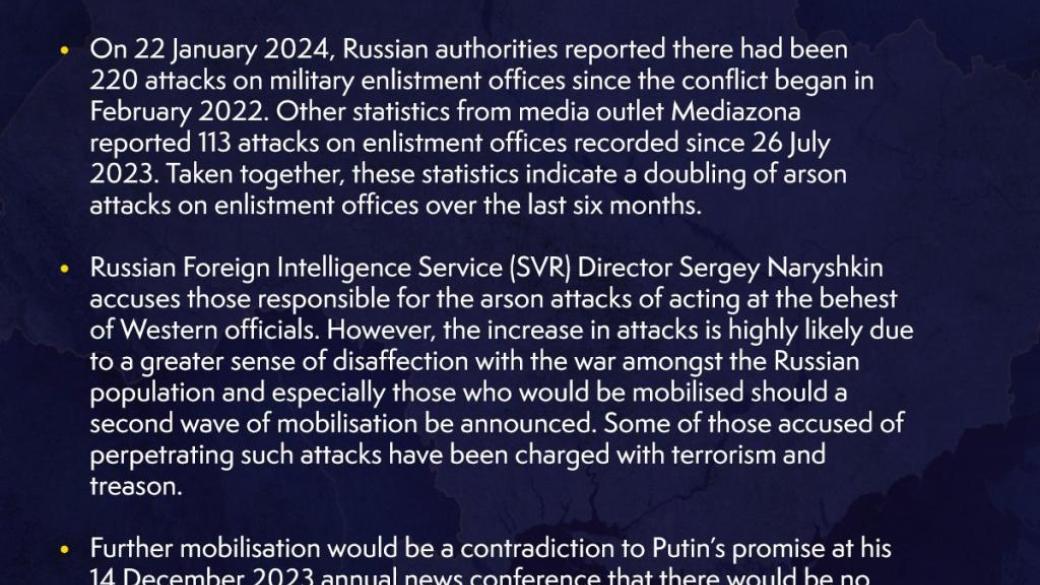 "Однако увеличение числа атак очень вероятно из-за все большего чувства недовольства войной среди российского населения, а особенно тех, кто может быть мобилизован, как только объявят о второй волне мобилизации. Новая мобилизация будет противоречить обещанию Путина от 14 декабря 2023 года о том, что новой волны не будет. Атаки с высокой вероятностью свидетельствуют о нехватке доверия к этим обещаниям".