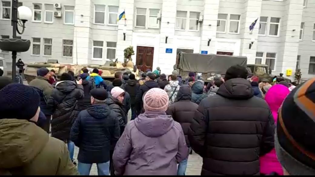 Митингующие вынудили захватчиков с центральной площади города убрать БТР и «Урал», сами российские военнослужащие скрылись в здании.