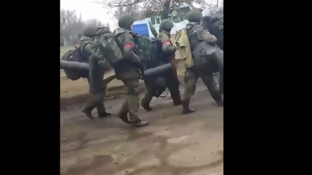 Судя по ролику, девять российские военные вместе с вещами бросили свою военную тяжелую технику и пешком «пошли в Россию».