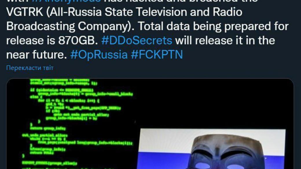 «Хакерская группа NB65, связанная с Anonymous, взломала ВГТРК (Всероссийская государственная телевизионная и радиовещательная компания). Общий объем данных, которые готовятся к выпуску, составляет 870 ГБ. DDoSecrets выпустит их в ближайшем будущем».