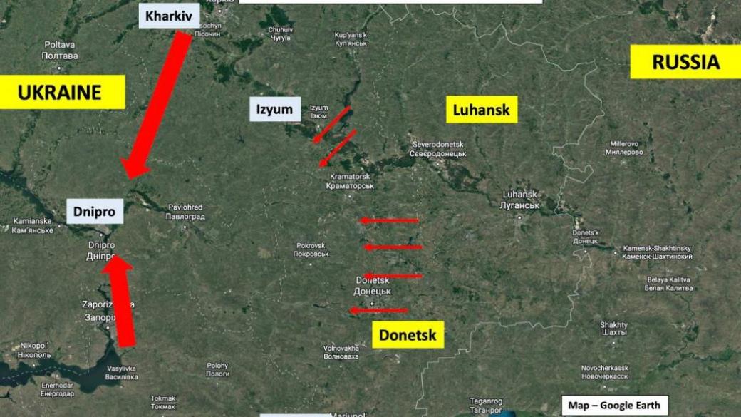 россияне попытаются наступить на Днепр с северо-востока и с юга. Параллельно им придется зафиксировать украинские силы в Луганске и Донецке. Конечная цель: захватить всю территорию Украины к востоку от Днепра и уничтожить украинские силы в рамках ООС на востоке.