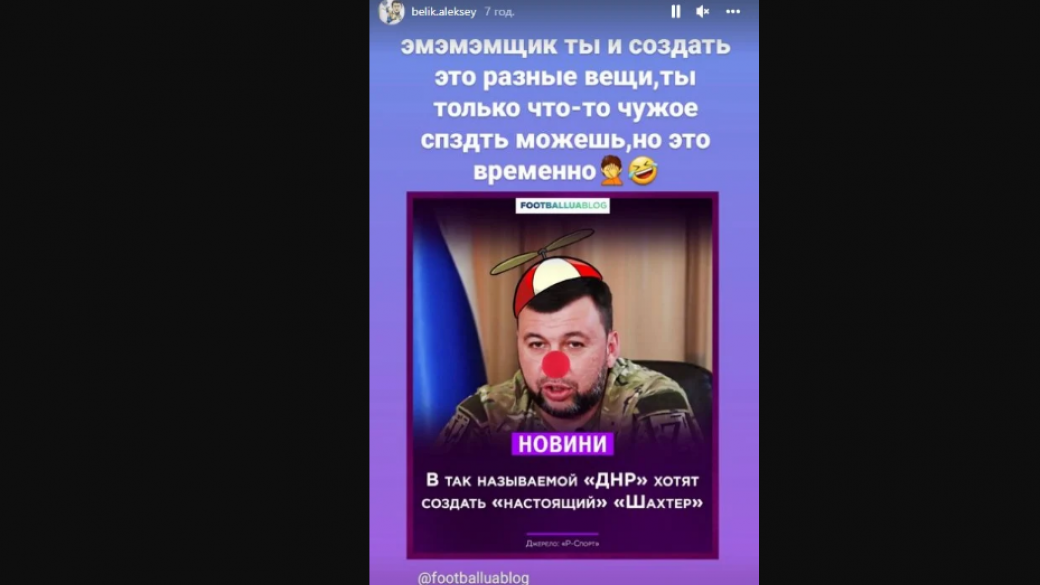Известный украинский футболист, бывший форвард донецкого ФК «Шахтер» Алексей Белик высмеял фантазии «главы ДНР» Дениса Пушилина о создании «настоящего Шахтера» в ОРДО. В своем Instagram написал, что в прошлом Пушилин «работал» в финансовой пирамиде «МММ», выманивая деньги у доверчивых людей и научился только воровать: