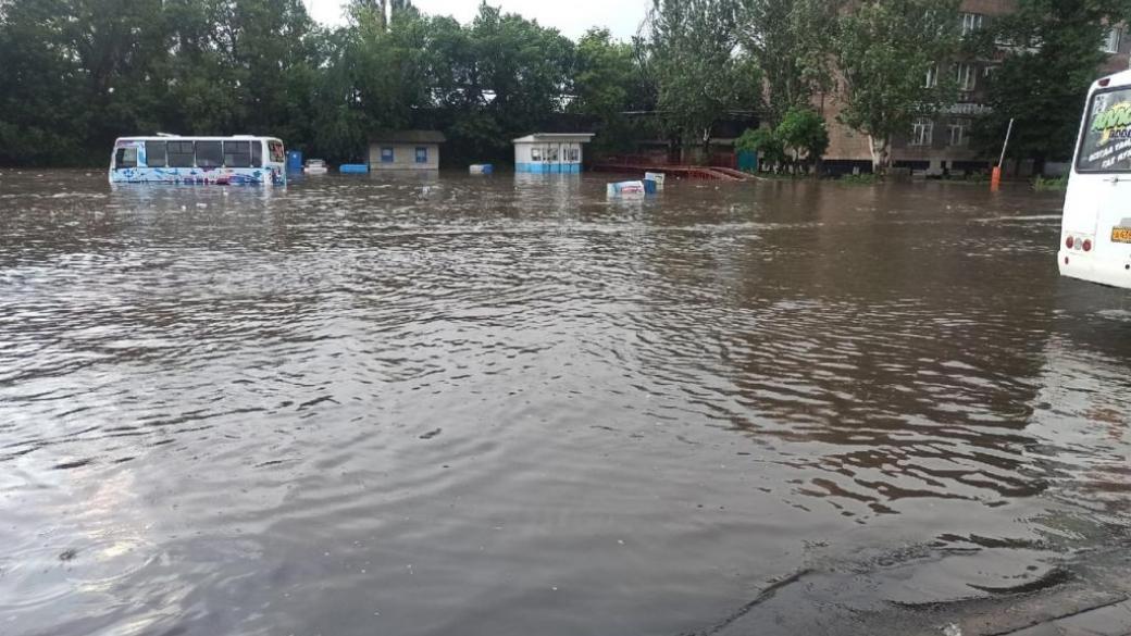 Сегодня в неподконтрольном Украине Донецке прошел сильный ливень, в результате которого улицы города затопило настолько, что транспорт не мог передвигаться. Об этом сообщают местные жители в социальных сетях.
